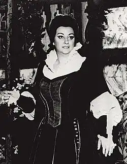 In 1969, Caballé appeared at the Arena di Verona in a Jean Vilar production of Verdi's Don Carlo. She was Elisabetta of Valois in an all-star cast including Plácido Domingo and Piero Cappuccilli.[26] In the same period she also appeared in recital at the Teatro Corallo in Verona. In 1970, Caballé made her official debut at La Scala in the title role of Lucrezia Borgia. She appeared as Leonora in Philadelphia, and returned to the Met as Amelia in a critically acclaimed production of Verdi's Un ballo in maschera with Domingo as Riccardo, and Reri Grist as Oscar.[27]