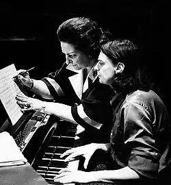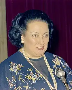 In 1974, Caballé appeared in the title role of Verdi's Aida at the Liceu in January, in Verdi's I vespri siciliani at the Met in March,[30] and in Parisina d'Este at Carnegie Hall, also in March.[31] She appeared as Norma at the Bolshoi Theatre in Moscow and in Adriana Lecouvreur at La Scala in April. She was filmed as Norma in Orange in July by Pierre Jourdan. She recorded Aida with Riccardo Muti in July and made a recording of duets with Giuseppe Di Stefano in August. In September 1974, she underwent major surgery to remove a large benign mass from her abdomen.[32] She recovered and was performing again onstage by early 1975. In 1976 Caballé appeared at the Met once again as Norma and sang her first Aida in that house, alongside Robert Nagy as Radamès and Marilyn Horne as Amneris.[33][34] She appeared in the title role of Ariadne auf Naxos by Richard Strauss and sang Mimì in Puccini's La bohème with Luciano Pavarotti as Rodolfo.[35][36]