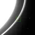 The Cassini mission,[21] which arrived at Saturn in July 2004, initially discovered three small inner moons: Methone and Pallene between Mimas and Enceladus, and the second trojan moon of Dione, Polydeuces. It also observed three suspected but unconfirmed moons in the F Ring.[22] In November 2004 Cassini scientists announced that the structure of Saturn's rings indicates the presence of several more moons orbiting within the rings, although only one, Daphnis, had been visually confirmed at the time.[23] In 2007 Anthe was announced.[24] In 2008 it was reported that Cassini observations of a depletion of energetic electrons in Saturn's magnetosphere near Rhea might be the signature of a tenuous ring system around Saturn's second largest moon.[25] In March 2009, Aegaeon, a moonlet within the G Ring, was announced.[26] In July of the same year, S/2009 S 1, the first moonlet within the B Ring, was observed.[27] In April 2014, the possible beginning of a new moon, within the A Ring, was reported.[28] (related image)