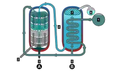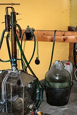 A spiral still is a type of column still with a simple slow air-cooled distillation apparatus, commonly used for bootlegging.[9] Column and cooler consist of a 5-foot-long (1.5 m) copper tube wound in spiral form. The tube first goes up to act as a simple column, and then down to cool the product. Cookware usually consists of a 30-litre (6.6 imp gal; 7.9 US gal) plastic wine bucket. The heat source is typically a thermal immersion circulator (commonly runs at 1200 W), like a sous vide stick because it is hard to find 300 W immersion heaters, and it is risky to disassemble the immersion heater from an electric water boiler because it may cause electrical injury. The spiral burner is popular because, despite its simple construction and low manufacturing cost, it can provide 95% ABV.