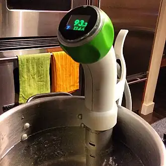 The preferred heat source for plastic stills or spiral stills is sous vide sticks; these control temperature, time, and circulation, and are therefore preferred over immersion heaters. Multiple units can be used to increase the wattage. Also, sous vide sticks, commonly sold in 1200 W and generally temperature regulated up to 90 °C (194 °F) (ethanol boils at 78 °C (172 °F)), will evaporate the ethanol faster than an immersion heater, commonly sold in 300 W. Electrical injury may occur if immersion heaters are modified, such as if a 35 °C (95 °F) thermostat is removed from an aquarium heater (because doing so may break its waterproofing), or if an immersion heater is disassembled from an electric water boiler.