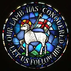The Moravian Church's emblem is the Lamb of God (Agnus Dei) with the flag of victory, surrounded by the Latin inscription "Vicit agnus noster, eum sequamur" ('Our Lamb has conquered; let us follow Him').