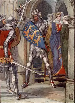 The grown-up Mordred becomes involved in the adventures of his brothers, first as a squire and then as a knight, as well as others such as Brunor, eventually joining King Arthur's elite fellowship of the Knights of the Round Table. Especially since the Post-Vulgate, Mordred tends to be depicted as murderously violent and known for his un-chivalrous and lustful habits, including engaging in rape (as in an incident in the Post-Vulgate Queste, when he brutally kills a maiden and is injured for his actions by King Bagdemagus, who is then in turn mortally wounded by Gawain; there is also an attempted rape in the standalone romance Claris et Laris).[19] Notably, it is Mordred who fatally stabs in the back one of the best Knights of the Round Table, Lamorak, in an unfair fight involving most of his brothers (one of whom had even murdered their own mother for being Lamorak's lover). Mordred displays stronger knightly values in the earlier Vulgate Cycle (as does Gawain too in comparison to his later Post-Vulgate portrayal), where he is also shown as womanising and murderous, but to a significantly lesser degree. The Prose Lancelot describes Mordred, at the age of 20, as "a large, tall knight; he had curly, blond hair and would have had a very handsome face if his demeanour had not been so wicked."[22] He becomes a protege and companion of the eponymous great knight Lancelot. The older knight comes to the young Mordred's rescue on multiple occasions, such as helping to save his life at the Castle of the White Thorn (Castel de la Blanche Espine), and Mordred in turn treats the much older Lancelot as his personal hero. In this version, his turning point toward villainy happens after they meet an old hermit monk who begins to tell his own prophecy for the two "most unfortunate knights", revealing Mordred's true parentage by Arthur and predicting Mordred's and Lancelot's respective roles in the coming ruin of Arthur's kingdom.[23] However, the angry Mordred kills the monk before he can finish. While Lancelot tells his secret lover Guinevere (but not Arthur), she refuses to believe in the story of the prophecy and does not banish Mordred. The young knight, on his part, tries to get himself killed before accepting his destiny. The Prose Lancelot indicates Mordred was about 22 years old at the time, as well as just two years into his knighthood.
