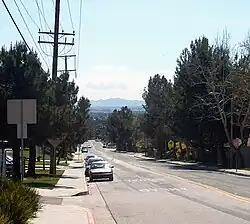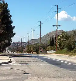 A view of Moreno Valley looking west down Ironwood Avenue. Box Springs Mountain is visible at right.