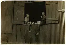 Lunchtime for two boys employed at the Economy Glass Works in Morgantown, 1908. Photo by Lewis Hine.