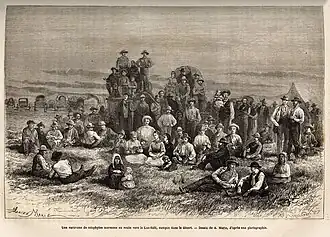 After the initial departure of the Latter-day Saints living in Illinois and Missouri, converts to the church from other areas in the United States and from Europe followed the initial trail to join the main body of the church in Salt Lake City. Every year from 1847 until 1869, church members making this journey were formed into organized companies.[14] Migration continued until about 1890, but those who came by railroad are not generally considered to be "Mormon pioneers."