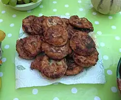 Salads include both raw and cooked vegetables, served either hot or cold.[25] They include zaalouk, an aubergine and tomato mixture, and taktouka, a mixture of tomatoes, smoked green peppers, garlic, and spices characteristic of the cities of Taza and Fes in the Atlas.[25] Another salad is called bakoula or khoubiza, consisting of braised mallow leaves, but can also be made with spinach or arugula, with parsley, cilantro, lemon, olive oil, and olives.