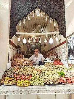 Spices and ras el hanout are used extensively in Moroccan food.[13][14][15] Although some spices have been imported to Morocco through the Arabs, introducing Persian and Arabic cooking influences, many ingredients—like saffron from Talaouine, mint and olives from Meknes, and oranges and lemons from Fes—are home-grown, and are being exported. After the Idrissids established Fes in 789, predominant in Arab culture, many spices were brought from the east.[16] Common spices include cinnamon, cumin, turmeric, ginger, paprika, coriander, saffron, mace, cloves, fennel, anise, nutmeg, cayenne pepper, fenugreek, caraway, black pepper and sesame seeds. Twenty-seven spices are combined for the Moroccan spice mixture ras el hanout.[17]