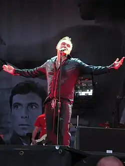 As frontman of the Smiths, Morrissey—described as "lanky, soft-spoken, bequiffed and bespectacled"[77]—subverted many of the norms that were associated with pop and rock music.[78] The band's aesthetic simplicity was a reaction to the excess personified by the New Romantics,[79] and while Morrissey adopted an androgynous appearance like the New Romantics or earlier glam rockers, his was far more subtle and understated.[80] According to one commentator, "he was bookish; he wore NHS spectacles and a hearing aid on stage; he was celibate. Worst of all, he was sincere", with his music being "so intoxicatingly melancholic, so dangerously thoughtful, so seductively funny that it lured its listeners ... into a relationship with him and his music instead of the world."[81] In an academic paper on the band, Julian Stringer characterised the Smiths as "one of Britain's most overtly political groups",[82] while in his study of their work, Andrew Warns termed them "this most anti-capitalist of bands".[83] Morrissey had been particularly vocal in his criticism of Prime Minister Margaret Thatcher; after the October 1984 Brighton hotel bombing, he commented that "the only sorrow" of it was "that Thatcher escaped unscathed".[84] In 1988 he stated that Section 28 "embodies Thatcher's very nature and her quite natural hatred".[84]
