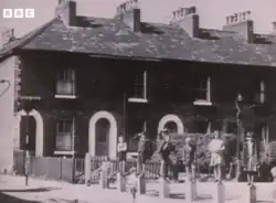 Steven Patrick Morrissey was born on 22 May 1959 in Old Trafford, Lancashire.[8] His parents, Elizabeth (née Dwyer) and Peter Morrissey, were Irish Catholics[9] who had emigrated to Manchester from Dublin with his only sibling, his elder sister, Jacqueline, a year before his birth.[10] Morrissey claims he was named after American actor Steve Cochran,[11] although he may instead have been named in honour of his father's brother who died in infancy, Patrick Steven Morrissey.[12] His earliest home was a council house at 17 Harper Street in the Queen's Square area of Hulme, inner Manchester, since demolished.[13][14][2] Living in that area as a child, he was deeply affected by the Moors murders, in which a number of local children were killed; the crimes had a lasting impression on him and would inspire the lyrics of the Smiths song "Suffer Little Children".[15] He also became aware of the anti-Irish sentiment in British society against Irish immigrants to Britain.[16] In 1970, after the "slum clearances" of Victorian-era houses in Hulme, the family moved to another council house at 384 King's Road in Stretford.[17]