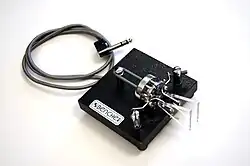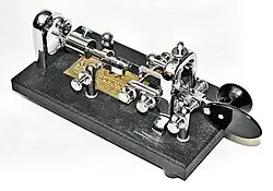 - ^ a b The semiautomatic key paddle, when pressed to the right by the thumb, kicks a clockwork-like horizontal pendulum that generates a series of dits, the length and timing of which are controlled by a sliding the pendulum weight toward the rear of the unit. When pressed to the left by the knuckle of the index finger, the paddle generates a single dah, the length of which is controlled by the operator. Multiple dahs require multiple presses. Left-handed operators may use a key built as a mirror image of this one.
