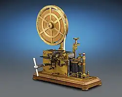 The Morse system for telegraphy was designed to make indentations on a paper tape when electric currents were received.[19] Morse's original telegraph receiver used a mechanical clockwork to move a paper tape. When an electrical current was received, an electromagnet engaged an armature that pushed a stylus onto the moving paper tape, making an indentation on the tape. When the current was interrupted, a spring retracted the stylus and that portion of the moving tape remained unmarked.