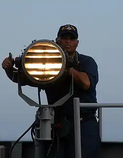Radio navigation aids such as VORs and NDBs for aeronautical use broadcast identifying information in the form of Morse Code, though many VOR stations now also provide voice identification.[46] Warships, including those of the U.S. Navy, have long used signal lamps to exchange messages in Morse code. Modern use continues, in part, as a way to communicate while maintaining radio silence.