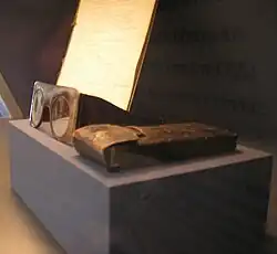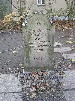 Mendelssohn died on 4 January 1786 as the result (it was thought at the time) of a cold contracted while carrying a manuscript (his reply to Jacobi, titled To Lessing's Friends (An die Freunde Lessings)) to his publishers on New Year's Eve; Jacobi was held by some to have been responsible for his death.[9] He was buried in the Jewish Cemetery of Berlin.[19] The translation of the Hebrew inscription on his gravestone (see picture to the right) reads: "H[ere] r[ests] / the wise R[eb] Moses of Dessau / born on the 12th of Elul 5489 [6 September 1729] / died on Wednesday the 5th of Shevat [4 January] / and buried the next morning on Thursday 6th/ 5546 [5 January 1786] / M[ay] H[is] S[oul be] B[ound up in the] B[ond of eternal] L[ife]".[20] Although the cemetery was largely destroyed during the Nazi era, after German reunification, in 2007–08, it was reestablished with monuments to its past, including a recreation of Mendelssohn's gravestone.
