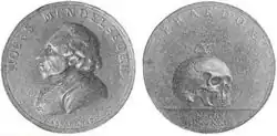 As a result of his correspondence with Abbt, Mendelssohn resolved to write on the immortality of the soul. Materialistic views were at the time rampant and fashionable, and faith in immortality was at a low ebb. At this favourable juncture appeared Phädon oder über die Unsterblichkeit der Seele (Phaedo or On the Immortality of Souls; 1767). Modelled on Plato's dialogue of the same name, Mendelssohn's work possessed some of the charm of its Greek exemplar and impressed the German world with its beauty and lucidity of style.[11] Phaedo was an immediate success, and besides being one of the most widely read books of its time in German was speedily translated into several European languages,[11] including English. The author was hailed as the "German Plato", or the "German Socrates"; royal and other aristocratic friends showered attentions on him, and it was said that "no stranger who came to Berlin failed to pay his personal respects to the German Socrates."[12]