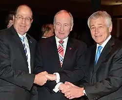 Ya'alon backed the Oslo Accords, but later he "admitted his mistake."[16] On 17 November 2008, Ya'alon announced that he was joining Likud and that he would participate in the primaries which would determine the Likud candidates for the 2009 elections.[17] He won eighth place on the party's list,[18] and entered the Knesset as Likud won 27 seats. Upon the formation of the Netanyahu government, he was appointed Vice Prime Minister (alongside Silvan Shalom) and Minister of Strategic Affairs. In March 2013, he replaced Ehud Barak as Defense Minister.[14]