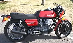 In November 1975 Guzzi first showed the 850 Le Mans at the Milan Show that was much later described as a "remarkably aggressive and attractive motorcycle".[18] Today the early versions, the Series I especially, are considered one of the most iconic and collectible of all V-twin Moto Guzzis.[19] A marketing success that would compete with other Italian superbikes, it spawned four later models from Mark II to its culmination in the 1990s, the Le Mans 1000 or Mark V. The initial model is known widely but incorrectly as the Mark I. Technically, it is simply the 850 Le Mans. It was named in homage to the 24-hour endurance race and circuit in France. The Mark I had two production runs with slight modifications. The first run, known as Series 1, used the roundish CEV stop/taillight used on many Italian bikes of the decade. Although it is often stated that fewer than 2,000 of these were made, Ian Falloon claims 219 were made in 1975 and a further 2,532 in 1976 although it is possible some of these were Series 2 bikes built at the end of the year. The Series 2 run totaled some 4,000 (2,548 in 1977, 1,737 in 1978).[20] Falloon gives total Mark I production as 7,036.[18] Series 2 used a De Tomaso-designed rectangular taillight/reflector and modified rear guard. This was also used on the Mark II and SP models. The taillight and guard was the biggest change between Series 1 and 2 but other modifications included later inclusion of a tripmeter, black fork lowers, a more generous dual seat that replaced the split-prone original seat, exhaust pipe heel guards and inferior fuel taps. The extra cost compared to the "cooking" T3 model paid for performance items such as high-compression domed pistons, larger inlet and exhaust valves and Dell'Orto 36 mm pumper carbs with filterless grey plastic velocity stacks. Most Mk I bikes were brilliant red although a very small number were painted in metallic ice blue. An exceedingly small number of Series 2 bikes were white.