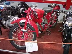 The period after World War II was as difficult in Mandello del Lario as it was elsewhere in post-war Europe. The solution was production of inexpensive, lighter cycles. The 1946 "Motoleggera", a 65 cc lightweight motorcycle originally—and still regularly—called the "Guzzino," became very popular in post-war Italy. It was produced until 1954.[12] One reason for its success was that, even though it had a somewhat bicycle-like appearance, it still looked and felt more like a motorcycle than other low-end motorized two wheelers in the Italian market at the time.[13] The Guzzinio was so popular that on 5 June 1949 Moto Guzzi held a rally for Guzzino owners at Mandello del Lario, attended by 14,000 people with 12,500 Guzzinos.[14][15] A four-stroke 175 cc scooter known as the "Galletto" also sold well. Though modest cycles for the company, the lighter cycles continue to feature Guzzi's innovation and commitment to quality. The step-through Galletto initially featured a manual, foot-shifted three-speed (160 cc) configuration then later a four-speed (175 cc) set-up by the end of 1952. The displacement was increased to 192 cc in 1954 and electric start was added in 1961.