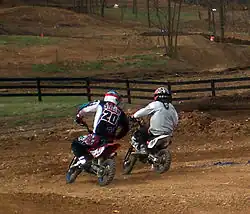 Two riders go into a corner at a mini-motocross event in West Virginia.