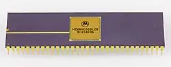 Motorola's first widely produced microprocessor was the 6800, introduced in early 1974 and available in quantity late that year.[7] The company set itself the goal of selling 25,000 units by September 1976, a goal they did meet. Although a capable design, it was eclipsed by more powerful designs, such as the Zilog Z80, and less expensive designs, such as the MOS Technology 6502.[8] By late 1976, the sales book was flat and the division was only saved by a project for General Motors that turned into a huge product line for engine control and other tasks.[9]