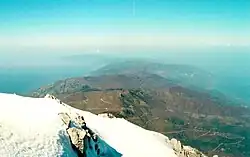 The peninsula, the easternmost "leg" of the larger Chalkidiki peninsula in central Macedonia, protrudes 50 km (31 mi)[7] into the Aegean Sea at a width of between 7 and 12 km (4.3 and 7.5 mi) and covers an area of 335.6 km2 (130 sq mi). The actual Mount Athos has steep, densely forested slopes reaching up to 2,033 m (6,670 ft). The Athos peninsula, unlike Sithonia and Kassandra, is a geological continuation of the Rhodope Mountains of northern Greece and Bulgaria.[8]