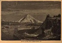 The first American, John Ledyard, reached the region aboard Captain Cook's ship in 1778.[91] By 1787, six Americans from Boston formed a company which began trading along the northwest coast.[91] The Lewis and Clark overland expedition reached the northwest coast in 1805 and observed Mount Rainier for the first time in early 1806.[91]