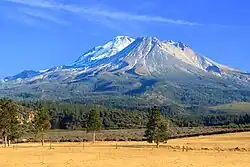 Mount Shasta (/ˈʃæstə/ SHASS-tə; Shasta: Waka-nunee-Tuki-wuki;[5] Karuk: Úytaahkoo)[6] is a potentially active[7] stratovolcano at the southern end of the Cascade Range in Siskiyou County, California. At an elevation of 14,179 ft (4,322 m), it is the second-highest peak in the Cascades and the fifth-highest in the state. Mount Shasta has an estimated volume of 85 cubic miles (350 cubic kilometers), which makes it the most voluminous stratovolcano in the Cascade Volcanic Arc.[8][9] The mountain and surrounding area are part of the Shasta–Trinity National Forest.