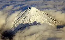 Mount Taranaki (Māori: Taranaki Maunga), officially Taranaki Maunga and also known as Mount Egmont, is a dormant stratovolcano in the Taranaki region on the west coast of New Zealand's North Island.[5][6][7] At 2,518 metres (8,261 ft), it is the second highest mountain in the North Island, after Mount Ruapehu. It has a secondary cone, Fanthams Peak (Māori: Panitahi), 1,966 metres (6,450 ft), on its south side.[8]