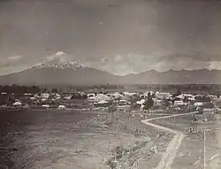 View of Mount Taranaki from Stratford, showing Fanthams Peak on the southern flank | |