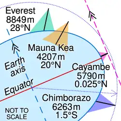 Everest is highest from sea level (green), Mauna Kea is highest from its base (orange), Cayambe is farthest from Earth's axis (pink) and Chimborazo is farthest from Earth's centre (blue)