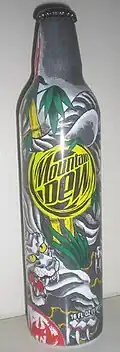 Mountain Dew's Green Label promotion originated in 2007, when a line of limited edition aluminum bottles was put into production, featuring artwork from a range of tattoo artists and other artists.[70] This initial series marked the first use of the term Green Label Art to describe the use of artistic works on Mountain Dew packaging.[71] In June 2010, a contest entitled "Green Label Art: Shop Series" was announced,[72] involving 35 independent skateboard store owners who partnered with local artists to design and submit future can artwork designs.[73] Approximately one million votes were submitted by the conclusion of the contest in October of the same year, with Street Science Skate Shop – a store in Tracy, California – named the winner of a cash prize. This winning can design was scheduled to appear on Mountain Dew cans at some point in 2011.[74]