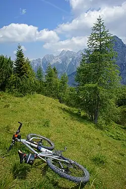 According to a review published by the International Mountain Bicycling Association, the environmental impact of mountain biking, as a relatively new sport, is poorly understood. The review notes that "as with all recreational pursuits, it is clear that mountain biking contributes some degree of environmental degradation".[44] Mountain biking can result in both soil and vegetation damage, which can be caused by skidding, but also by the construction of unauthorised features such as jumps and bridges, and trails themselves.[45] Several studies have reported that a mountain bike's impact on a given length of trail surface is comparable to that of a hiker, and substantially less than that of an equestrian or motorized off-road vehicle.[46][47][48][49]