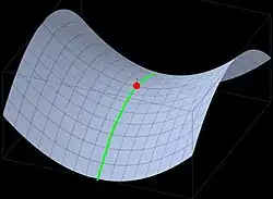 Mountain passes make use of a gap, saddle, col or notch. A topographic saddle is analogous to the mathematical concept of a saddle surface, with a saddle point marking the minimum high point between two valleys and the lowest point along a ridge.[2][3] On a topographic map, passes can be identified by contour lines with an hourglass shape, which indicates a low spot between two higher points.[4] In the high mountains, a difference of 2,000 meters (6,600 ft) between the summit and the mountain is defined as a mountain pass.[5]