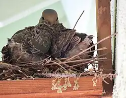The male then leads the female to potential nest sites, and the female will choose one. The female dove builds the nest. The male will fly about, gather material, and bring it to her. The male will stand on the female's back and give the material to the female, who then builds it into the nest.[37] The nest is constructed of twigs, conifer needles, or grass blades, and is of flimsy construction.[18] Mourning doves will sometimes requisition the unused nests of other mourning doves, other birds, or arboreal mammals such as squirrels.[38]