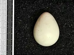 The clutch size is almost always two eggs.[37] Occasionally, a female will lay her eggs in the nest of another pair, leading to three or four eggs in the nest.[39] The eggs are white, 6.6 ml (0.23 imp fl oz; 0.22 US fl oz), 2.57–2.96 cm (1.01–1.17 in) long, 2.06–2.30 cm (0.81–0.91 in) wide, 6–7 g (0.21–0.25 oz) at laying (5–6% of female body mass). Both sexes incubate, the male from morning to afternoon, and the female the rest of the day and at night. Mourning doves are devoted parents; nests are rarely left unattended by the adults.[37]