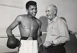 Clay was first directed toward boxing by Louisville police officer and boxing coach Joe E. Martin,[23] who encountered the 12-year-old fuming over a thief having taken his bicycle. He told the officer he was going to "whup" the thief. The officer told Clay he had better learn how to box first.[24] Initially, Clay did not take up Martin's offer, but after seeing amateur boxers on a local television boxing program called Tomorrow's Champions, Clay was interested in the prospect of fighting.[25] He then began to work with trainer Fred Stoner, whom he credits with giving him the "real training", eventually molding "my style, my stamina and my system". For the last four years of Clay's amateur career he was trained by boxing cutman Chuck Bodak.[26]
