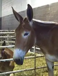 In general terms, in both mules and hinnies, the foreparts and head of the animal are similar to those of the sire (father), while the hindparts and tail tend to resemble those of the dam (mother).[7]: 36 Mules are generally larger than hinnies, with longer ears and a heavier head like donkeys, while their tails are usually covered with long hair like that of horses.[7]: 37 Mules have thin limbs, small narrow hooves, and short manes like donkeys, while their height, shape of neck and body, and uniformity of their coat and teeth are more similar to what is seen in horses.[22]