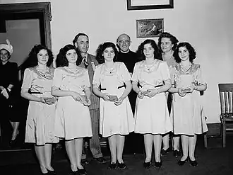 Quintuplets occur naturally in 1 in 55,000,000 births.[19] The first quintuplets known to survive infancy were the identical female Canadian Dionne quintuplets, born in 1934. Quintuplets are sometimes referred to as "quins" in the UK[20] and "quints" in North America.[21] A famous set of all-girl quintuplets are the Busby quints from the TV series OutDaughtered.