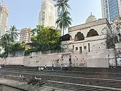 King Bhimdev founded his kingdom in the region in the late 13th century and established his capital in Mahikawati (present day Mahim).[86] The Pathare Prabhus, among the earliest known settlers of the city, were brought to Mahikawati from Saurashtra in Gujarat around 1298 by Bhimdev.[87] The Delhi Sultanate annexed the islands in 1347–48 and controlled it until 1407. During this time, the islands were administered by the Muslim Governors of Gujarat, appointed by the Delhi Sultanate.[88][89] The islands were later governed by the independent Gujarat Sultanate, established in 1407. As a result, numerous mosques were built, including the Haji Ali Dargah in Worli. Erected in 1431, the structure pays homage to the Muslim saint, Haji Ali.[90] From 1429 to 1431, the islands were a source of contention between the Gujarat Sultanate and the Bahmani Sultanate of Deccan.[91][92] In 1493, Bahadur Khan Gilani of the Bahmani Sultanate attempted to conquer the islands but was defeated.[93]