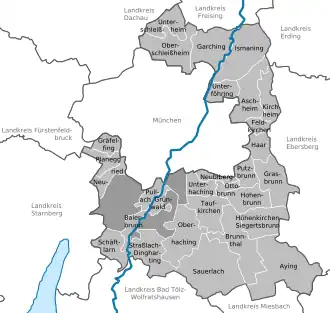 Munich (German: Landkreis München) is a Landkreis (district) in Bavaria, Germany. It borders (from the north and clockwise) the districts of Dachau, Freising, Erding, Ebersberg, Rosenheim, Miesbach, Bad Tölz-Wolfratshausen, Starnberg, Fürstenfeldbruck, and almost encircles (except for the west and northwest sides) the district-free city of Munich itself, which is the district seat.