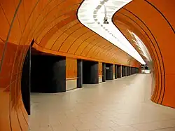 The interior has been updated with horizontally corrugated metal wall covering in fluorescent yellow. The square support columns are decked in deep blue tiles with blue lights casting down, giving them blue hue. The ceiling is covered with mirrors, giving the "infinite" height. The mezzanine level had been updated with new white floor. The aboveground tram and bus station received the new organic-shaped covering roof. An interesting fact: prior to renovation, the name was spelled with extra "e" in "Münchener". After the completion, the name is now "Münchner Freiheit" eliminating the extra "e", reflecting the current spelling trend, as well as a "return" towards more traditional Bavarian habits of spelling and pronunciation. Thus, it precisely mirrors the spelling on the street signs above.
