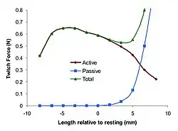 Length-tension relationship relates the strength of an isometric contraction to the length of the muscle at which the contraction occurs. Muscles operate with greatest active tension when close to an ideal length (often their resting length). When stretched or shortened beyond this (whether due to the action of the muscle itself or by an outside force), the maximum active tension generated decreases.[32] This decrease is minimal for small deviations, but the tension drops off rapidly as the length deviates further from the ideal. Due to the presence of elastic proteins within a muscle cell (such as titin) and extracellular matrix, as the muscle is stretched beyond a given length, there is an entirely passive tension, which opposes lengthening. Combined, there is a strong resistance to lengthening an active muscle far beyond the peak of active tension.