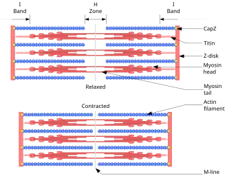 26. ^ Horowits R, Podolsky RJ (November 1987). "The positional stability of thick filaments in activated skeletal muscle depends on sarcomere length: evidence for the role of titin filaments". J. Cell Biol. 105 (5): 2217–23. doi:10.1083/jcb.105.5.2217. PMC 2114850. PMID 3680378.