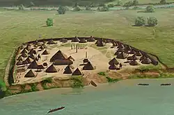 The early historic Muscogee were descendants of the Mississippian culture along the Tennessee River in modern Tennessee,[9] Georgia, and Alabama. They may have been related to the Tama of central Georgia. Muscogee oral history describes a migration from places west of the Mississippi River, in which they eventually settled on the east bank of the Ocmulgee River.[10] Here they waged war against other bands of Native American Indians, such as the Savanna, Ogeeche, Wapoo, Santee, Yamasee, Utina, Icofan, Patican and others, until at length they had overcome them,[11] and absorbed some as confederates into their tribe.[10]