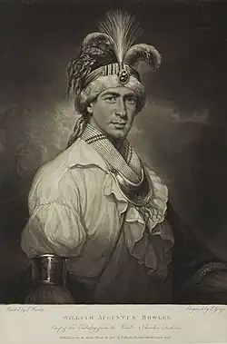 William Augustus Bowles was born into a wealthy Maryland Tory family, enlisting with the Maryland Loyalists Battalion at age 14 and becoming an ensign in the Royal Navy by age 15. Cashiered for dereliction of duty after returning too late to his ship at Pensacola, Bowles escaped north and found refuge among the Lower Creek towns of the Chattahoochee basin. He married two wives, one Cherokee and the other a daughter of the Hitchiti Muscogee chieftain William Perryman, and later used this union as the basis for his claim to exert political influence among the Creeks.[38]