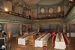 The interior of Wilton's Music Hall (here, being set for a wedding). The line of tables give some idea of how early music halls were used as supper clubs.