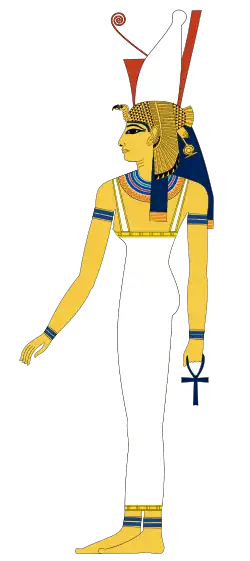 ![]() A contemporary image of goddess Mut, depicted as a woman wearing the double crown plus a royal vulture headdress, associating her with Nekhbet. | ||||||||