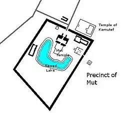 The Mut Temple describes the creation of the Isheru lake, with different texts attributing its excavation to Ra-Atum, Nun, or groups of primeval deities. In some versions, Atum-Ra digs out the Isheru for Mut, surrounding it with cooling waters to calm her fiery nature. Another account has Nun forming the Isheru to soothe Mut’s essence and establish her temple after her she returns to Thebes pregnant with Khonsu. Other texts mention the Primeval Gods constructing the lake under Ra's command. When Mut returns from the desert, Thoth appeases her, and Ra orders the gods to dig a canal in Thebes, extracting its waters to please her. Despite Mut's intense heat, they work with hoes and shovels, and the name "Isheru" comes from the gods' exclamations of suffering as they complete the task.[21]