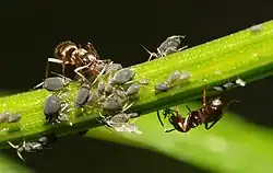 Another type is ant protection of aphids, where the aphids trade sugar-rich honeydew (a by-product of their mode of feeding on plant sap) in return for defense against predators such as ladybugs.