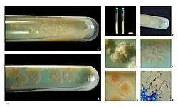M. tuberculosis can be grown in the laboratory. Compared to other commonly studied bacteria, M. tuberculosis has a remarkably slow growth rate, doubling roughly once per day. Commonly used media include liquids such as Middlebrook 7H9 or 7H12, egg-based solid media such as Lowenstein-Jensen, and solid agar-based such as Middlebrook 7H11 or 7H10.[8][12] Visible colonies require several weeks to grow on agar plates. Mycobacteria growth indicator tubes can contain a gel that emits fluorescent light if mycobacteria are grown. It is distinguished from other mycobacteria by its production of catalase and niacin.[13] Other tests to confirm its identity include gene probes and MALDI-TOF.[14][15]
